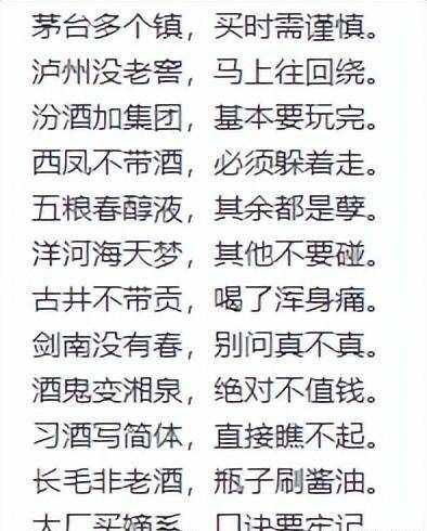 这类酒也特别常见,它们往往利用一字之差的视觉差异,让消费者入套,什么午栏山、好村长、四粮液,让人哭笑不得。不过这些山寨酒也很好分辨,大家细心一点就能避免踩坑了。有网友还为此编了一段顺口溜,大家常看常新!