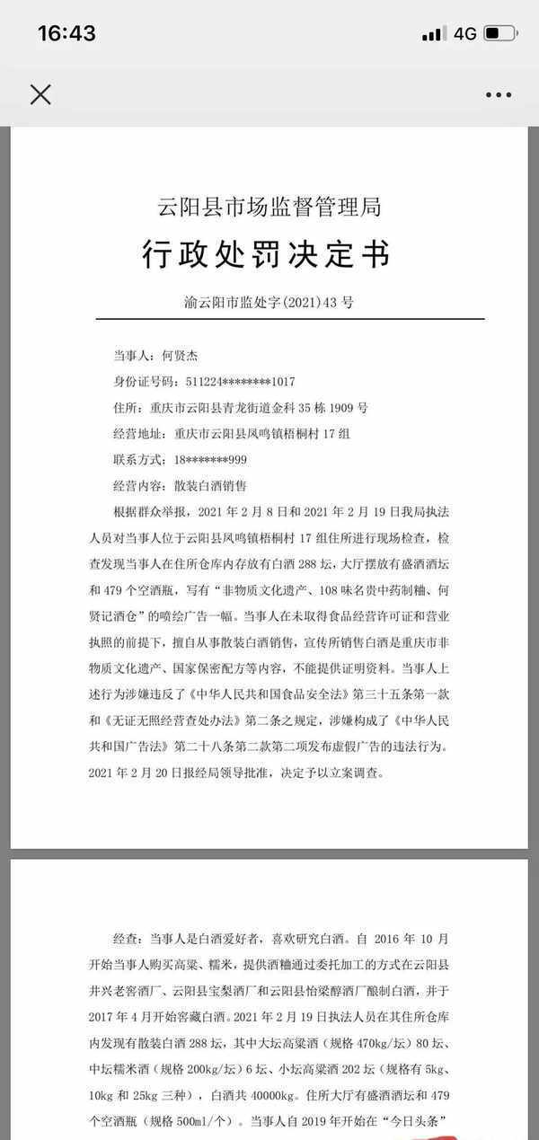 这是何贤杰(守正说酒)的行政处罚书,具体内容参考官方网站。其实内容归纳一下很简单,就是虚假宣传都是骗人的。三个代守正加工的酒厂,我用企查查都看过了,就是三个家庭作坊,简单地跟一张白纸一样。重庆当地人都知道,重庆能产什么酒?遍地的都是家庭小作坊,散酒,本质也就是小曲清香。浓香酱香工艺复杂,投资额也大,所以家庭小作坊是产不出来的。大道至简,弄清楚本质问题,看事情就特别简单!