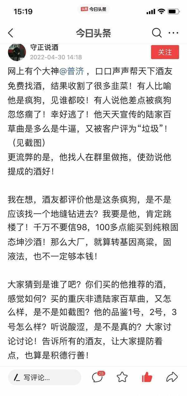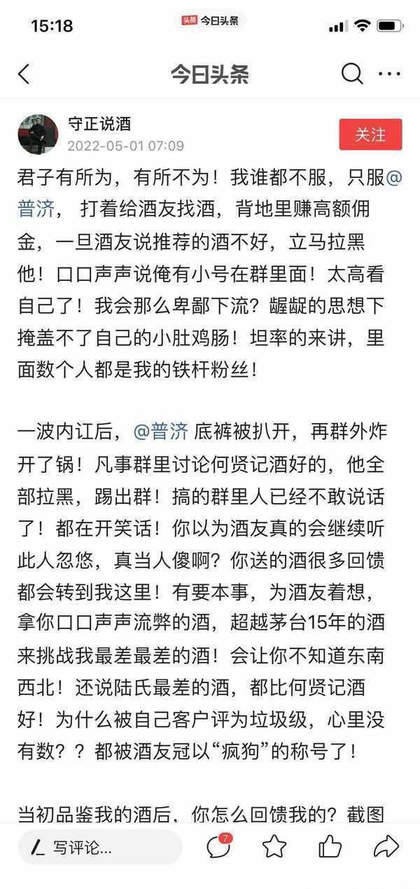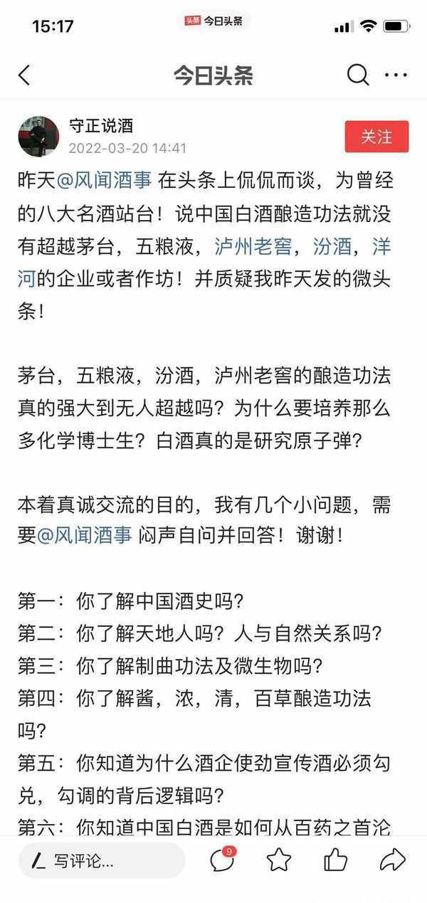 最后说一下守正大师点名的风闻酒事,我一直也是他的粉丝,看了很多。目前其实很简单,就是个头条运营号,还没卖酒,搬运各种酒圈新闻,博取流量赚点钱,比喻的话,可以说是记者?狗仔队?也不怎么恰当。对于刚入酒圈的初学者来说,绝对值得看看,内容很不错。对其本人不了解,喝不喝酒也不知道,但是至少搬运新闻这一块,还是有水平的,为大家省时省力纵观白酒圈大小事情。