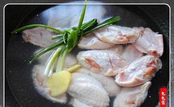 2、锅中加冷水,鸡翅放入锅中,将两根小葱打结放进去,然后加入葱、姜、料酒,焯水2-3分钟,捞出沥水备用。