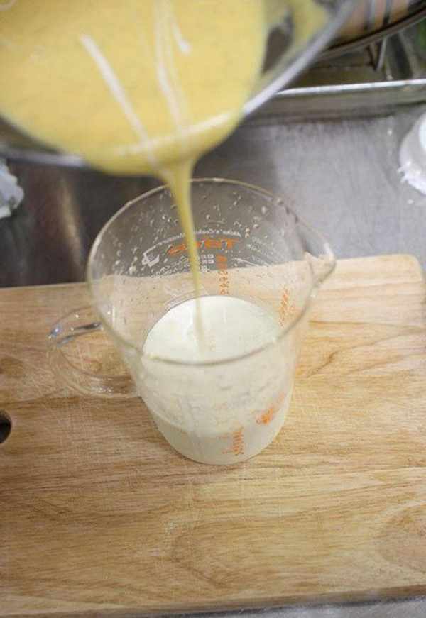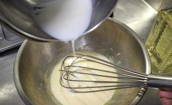 4.一面搅拌蛋黄,一面将鲜奶缓缓倒入。