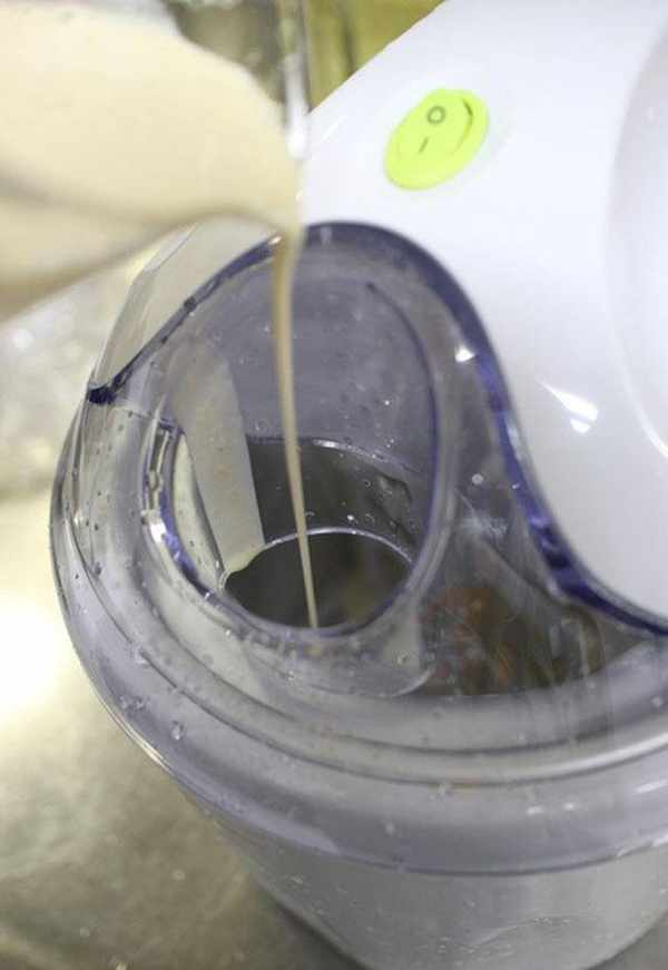 11.装好冰淇淋机并启动,缓缓将材料倒入,尽量直接流到锅底,滴到壁边的话,有时候会马上结冻,搅拌片会转不顺。
