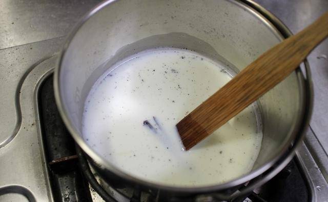 3.锅中倒入鲜奶加入香草一同加热,温度约80度。