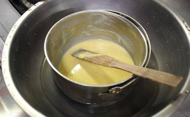 我觉得这部分是最麻烦的,因为炉架要高一点,火要用最小,避免过程中蛋黄凝结成粉状。试过隔水加热,但是要煮很久。我在旁边洗个锅子,一没注意它就凝结了。