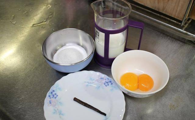 蛋黄2个、鲜奶160毫升、鲜奶油200毫升、香草豆荚1/2根、白砂糖60克(如果使用含糖鲜奶油,糖减为30克)