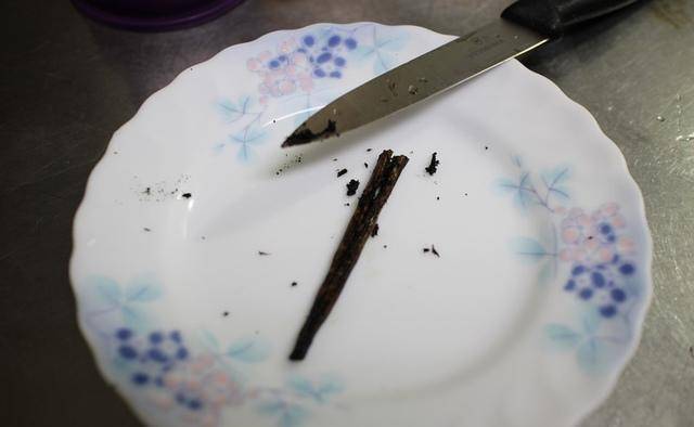 2.取半截香草豆荚,中间划开后,将香草籽稍微刮一下。
