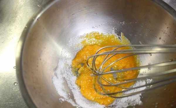 1.先将蛋黄+白砂糖,放入烘焙打蛋盆中用打蛋器搅拌至砂糖溶化差不多,且蛋黄变白。