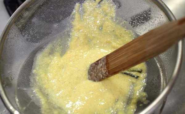 6.过滤后的蛋黄浆放到水盆冷却,然后放进冰箱1小时让他变得冰凉,——(注意,所有食材都必须是冰凉状态才行,否则放进冰淇淋机时会无法凝固)。