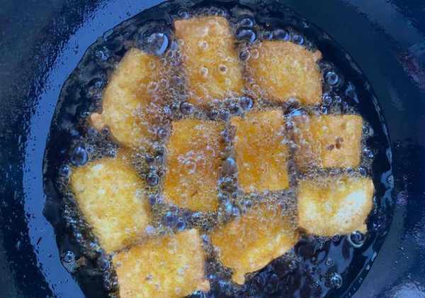 第四步:油炸臭豆腐。将油温升至7成热,一块块下入腌好的豆腐,把豆腐炸至两面金黄就可捞出,切记不可炸老,影响口感。