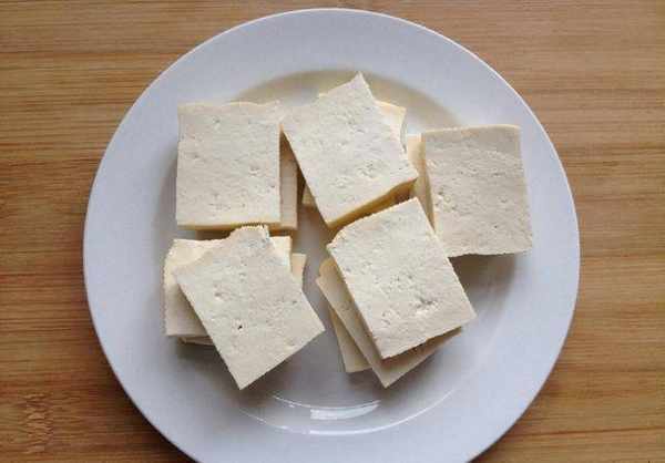 第一步:准备豆腐。不选老豆腐,中等豆腐就好。切成大小均匀的块状备用。