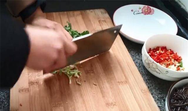3、黄瓜切成小块,放在碗底,然后加入粉,再把蒜末、小米椒、香菜切碎,放在另一个碗里待用。