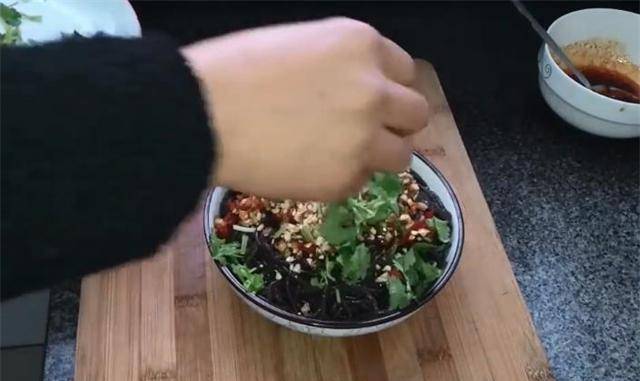 5、将调料放入一碗玉米根粉中,加入碎花生,加入香菜搅拌均匀即可食用。