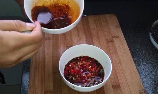 4、再准备热辣子,取一个空盘,倒入红辣椒和白芝麻,锅内倒入适量的油,待油热后放入八角和花椒,炒出香味,然后取出八角和Avoahy辣椒,将热油倒入辣椒碗中,加入煮熟的醋用勺子拌匀,加入生抽,陈醋,盐,糖,撒少许。花椒水,将调好的油倒入另一碗辣椒调料中,用筷子拌匀。
