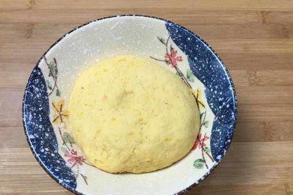 2、时间到了,把蒸好的红薯拿出,用勺子把红薯压成细腻一点的红薯泥。晾至不烫手放到大碗里,再倒入150克面粉。先用温水把酵母搅开,不用再放水和面,红薯的水分基本差不多。如果干可以再少放一点水,然后下手揉成软硬、适中、光滑的面团,然后饧发面。