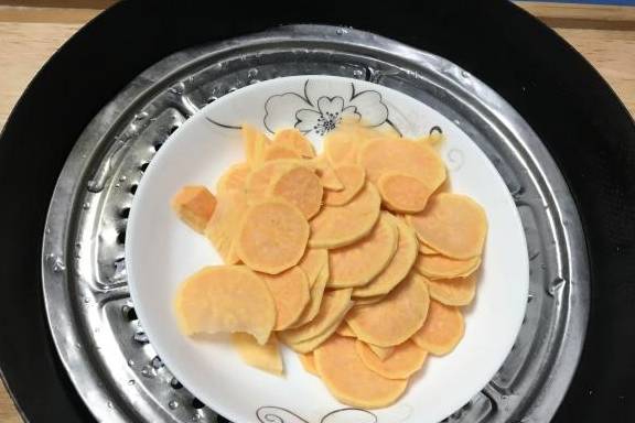 1、咱们首先把买来的红薯清洗干净。,用刮皮刀刮去外皮,然后用刀切成薄薄的片,切好以后放到盘子里。再把锅中放水,放上帘子,然后放上装红薯片的盘子开始蒸红薯,大火烧开,上汽开始算时间,大约12分钟左右就可以蒸熟了。