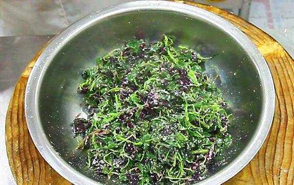 2.第二步,我们把苋菜上锅蒸一下,锅内烧水,放上蓖子,盖上锅盖,开大火,把水烧开后,放入拌好面粉的苋菜叶,苋菜非常好熟,一般蒸三分钟左右就可以了。三分钟后,把蓖子端出锅,把苋菜叶倒入盆中抖散,一定要在温度没有凉下来之前拌散,再撒上一点食盐,颠盘拌匀后,装在盘里。