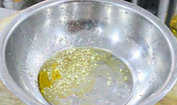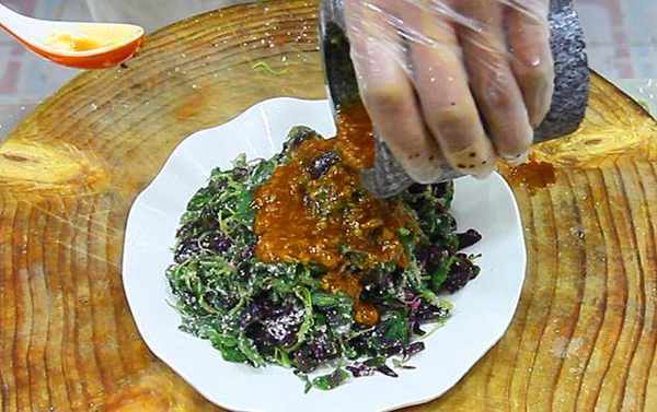3.最后一步,我们做拌料,用蒜臼子捣一点蒜泥,捣蒜泥时加一点食盐,再倒入芝麻油,红油,生抽搅拌均匀后,倒在蒸好的苋菜上,也可以在拌散苋菜时拌入。