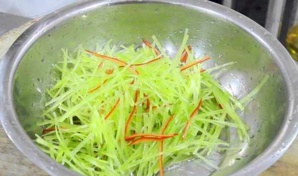 2.再来个红椒切丝配个颜色,红椒丝切好后,与莴笋丝一块泡在凉水中,使其充分吸水舒展开来,口感会更加清爽细腻。