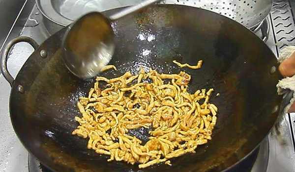 4.开始烹炒,锅里倒入植物油,充分滑锅后,倒出热油,加入凉油。热锅凉油,炒肉丝的时候不容易粘锅,当我们把肉丝炒变色后,盛出来倒在漏勺上,控油,炒肉丝一定要低温滑油,口感才够嫩。