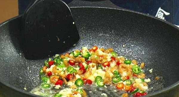 3.锅内烧油,倒入海米,小火煸炒一会,把香味煸出来,放入蒜末一起炒,炒出蒜香味,再倒入青红椒圈,继续炒,让香辣味充分地融合。