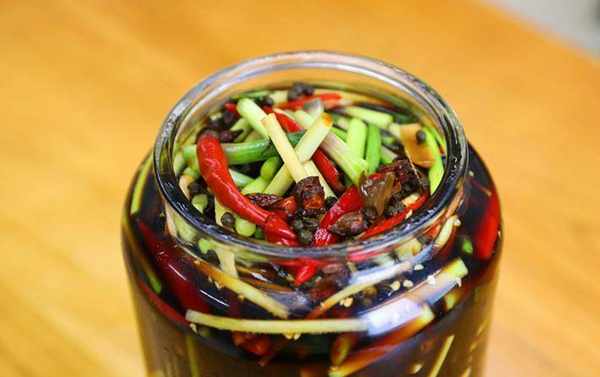 4.腌好以后把蒜苔取出来,腌出来的水分就不要了,然后把蒜苔放入干净的罐子里面,再准备一些小米椒段和姜丝,和蒜苔交叉着放,最后留一点小米椒、姜丝封口。倒入晾凉的腌料,淋上一些高度白酒,然后盖上盖子,上下摇晃几下,密封腌制两天就能食用了,腌的时间越长,越脆越入味。