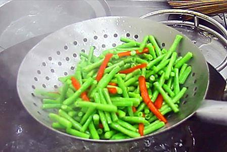 3.起锅烧水,先把长豆角焯一下水,水开后,倒入长豆角和红椒,焯水40秒左右,当长豆角变为青色,断生后,捞出控水,给长豆角焯水,是豆角清脆爽口不夹生的关键。