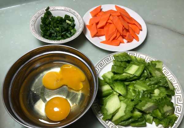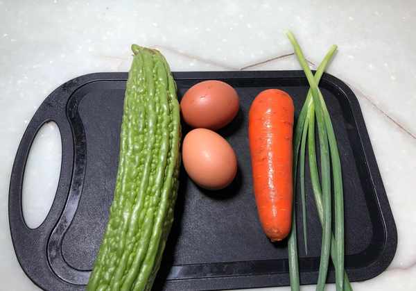 《准备食材》:胡萝卜1根,苦瓜1个,鸡蛋3个,小葱2颗