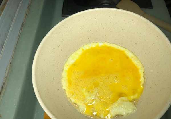 ⑵:鸡蛋打入碗里,加入1克盐搅拌均匀,锅内加入适量的油,油热后放入鸡蛋,把鸡蛋炒熟放入碗内备用。