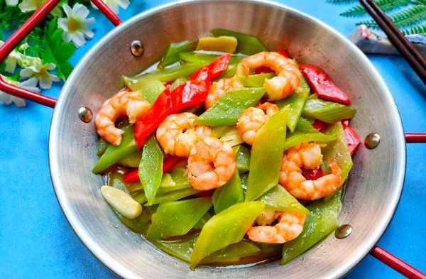 锅中加水烧开,将生菜片和红辣椒块同时倒入锅中焯一下,半分钟后捞出,时间不要太长。加热煎锅并倒入油。当油温达到50%时,倒入虾仁翻炒。炸好变色后,加入少许蒜片。