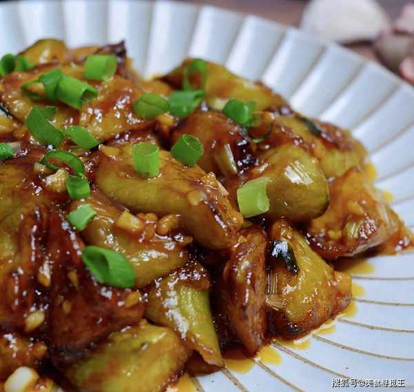 3、热油锅,先下入茄子,小火煎至变软后盛出备用;稍加油,将蒜末、葱花爆香,倒入茄子,将料汁也倒入里面,翻拌均匀,炒至汤汁粘稠就可以直接关火上桌了!
