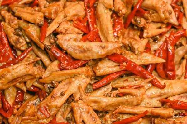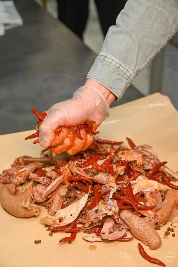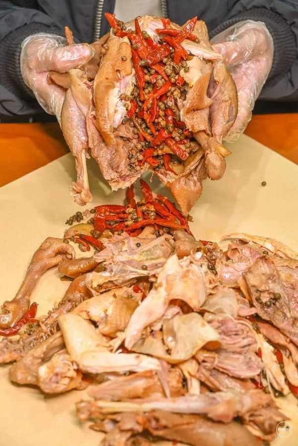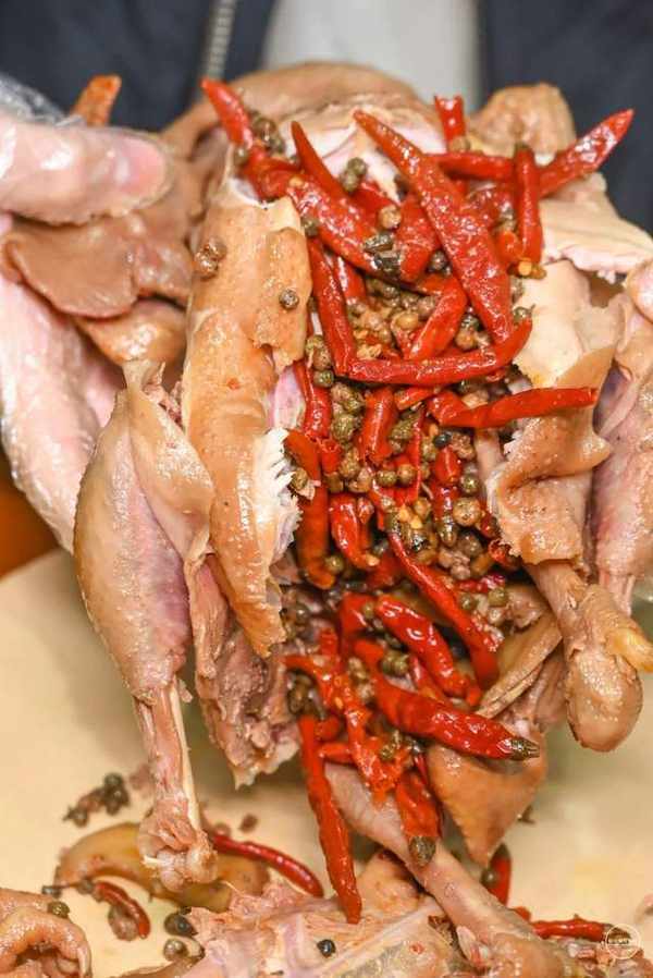 而且店内每天只做100只,卖完就没有了。麻椒鸡!和一般烧鸡不同的是鸡肚内满满的辣椒麻椒。打开的一瞬间,浓烈的辣椒麻椒香气。