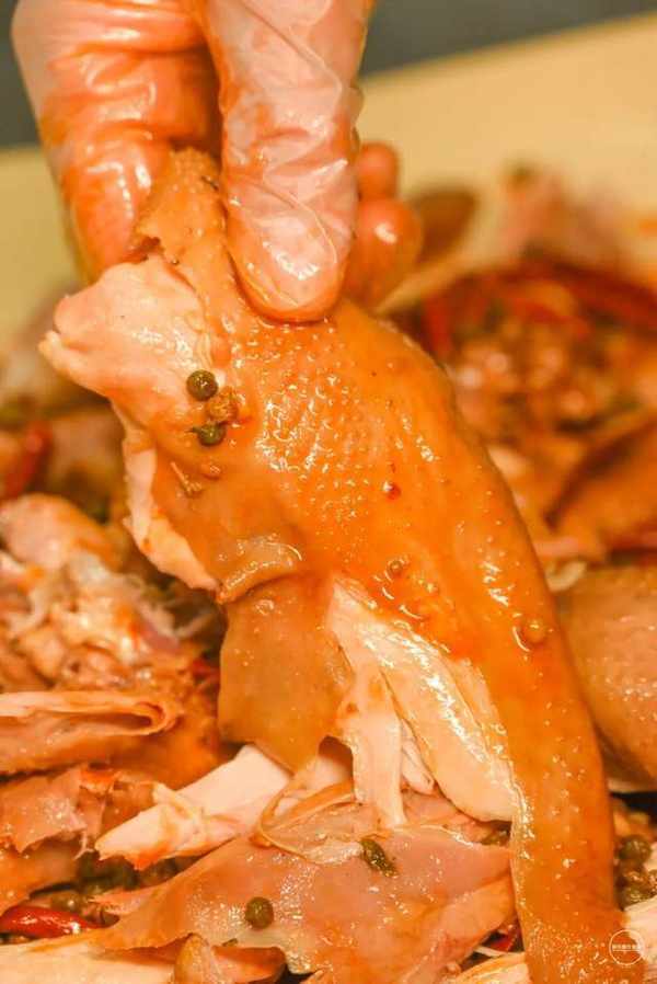 经过多道工序制作,整体色泽鲜亮、撕开之后,把肚子里的辣椒麻椒捏一下,汁水四溢,淋在鸡肉上拌匀,会更加觉得麻辣劲爽,而且整体吃起来会感叹:终于有一款有“鸡”味儿的烧鸡了!