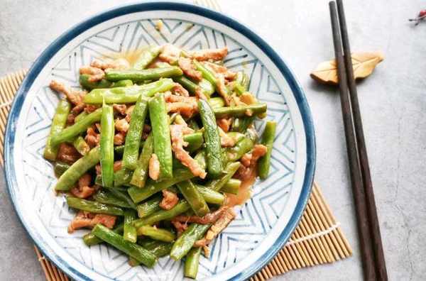 留底油下蒜、姜爆香,倒入四季豆翻炒,翻炒均匀,加盐提味。翻炒几下后倒入肉丝,加少许酱油翻炒均匀即可出锅。