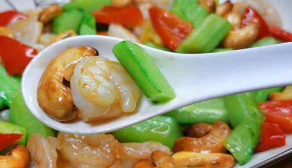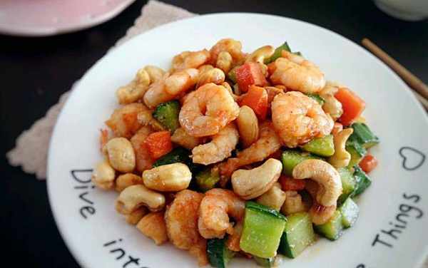 炒匀时加少许盐调味,然后倒入虾仁和腰果一起炒,快速翻炒均匀即可出锅。