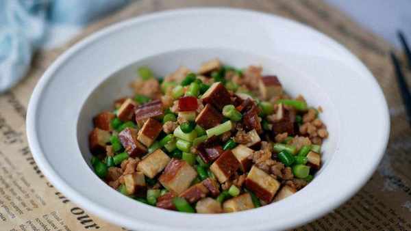 蒜苗洗净切丁,豆腐干洗净切丁,小米椒洗净切圈。
