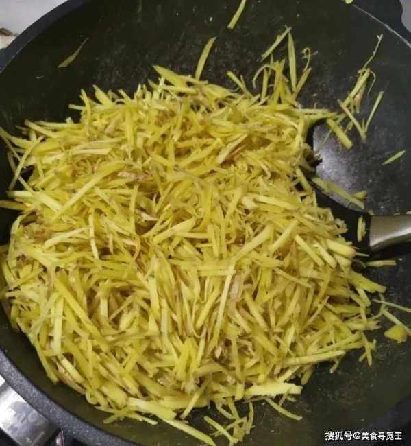 3、如果家里有不粘锅最好,如果没有,选择无水无油的平底锅;倒入切好的姜丝,先开大火炒至水分稍微收干,观察姜丝状态,变软后转成小火继续炒制;