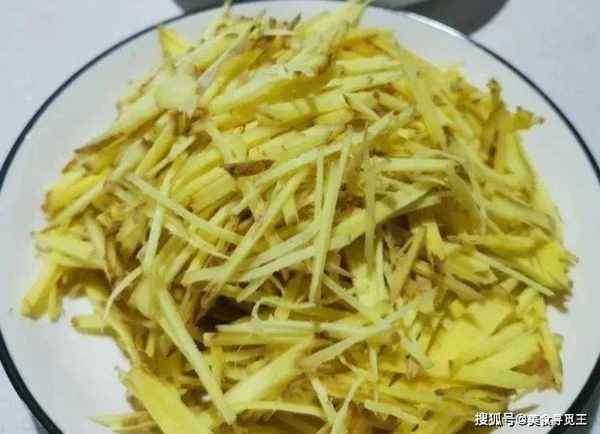2、洗净后把生姜切成丝,尽可能地均匀一些;这样在炒制过程中,收缩程度会一致,避免有的炒糊了,有的还鲜嫩多汁呢;