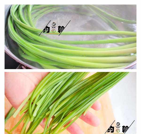 1.将蒜苗的顶部捏掉,洗净,放入沸水中焯1分钟至烂为止。
