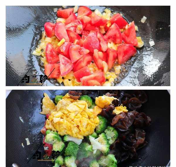 配料表:西兰花、番茄、木耳、鸡蛋2个、葱花、姜片、蒜片、盐、糖、酱油、蚝油