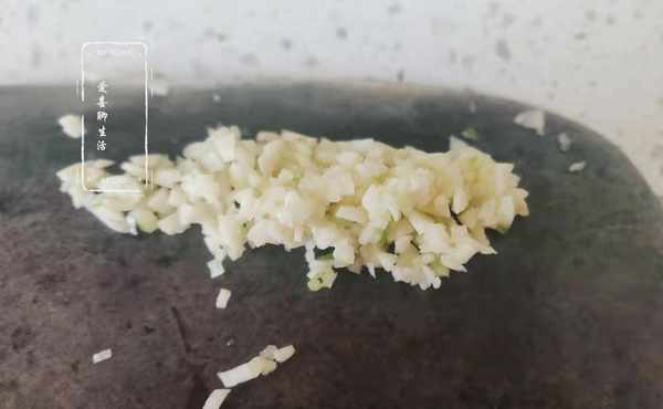 第三步是准备调料。焯水的时候,我们把2瓣大蒜压扁,剥去外皮,拍碎,剁成碎末备用。