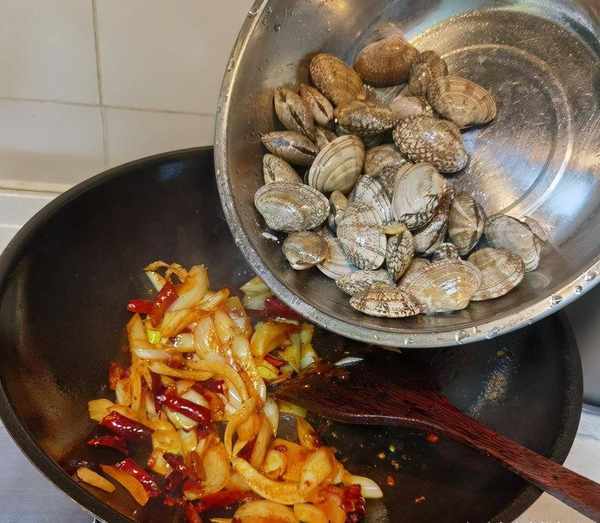 然后就可以起锅了,先在锅里放几片姜,然后把花甲铺在姜片上面,然后把料酒倒进锅里,盖上锅盖焖1分钟,这个步骤很好有去腥的效果。炖好后壳会裂开,可以把壳拿出来备用。然后在锅里加入适量的底油,然后将切好的姜末和蒜末放入油锅中,油炸香,根据口味放入少许干辣椒,然后我们就可以倒入了将花甲放入锅中翻炒,加入适量生抽提味提鲜,再翻炒,使锅中的酱油和花甲混合均匀。