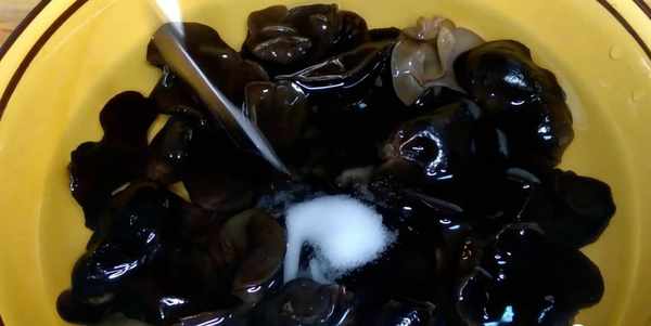 木耳充分泡发好以后,在里面加入一小勺的食盐,然后给它揉搓清洗,加入盐才能把木耳的灰尘和杂质给它清洗干净,这个时候再把木耳的根蒂给它摘掉,再用清水给它清洗两遍。
