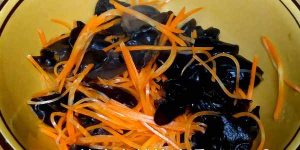 锅中烧上水,加入一点食用盐,入底味,再加入少许的油,这样烫出的菜颜色更好看。然后倒入木耳焯水,水烧开以后,把木耳烫一分钟左右,然后倒入胡萝卜丝,胡萝卜丝稍微烫一下就可以了。然后把它捞出来放入一个小碗中,让它自然的凉透。