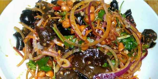 下面再准备一个大一点的汤碗,放入切好的洋葱丝、木耳和胡萝卜,然后再放上炸好的花生米和香菜段,倒入我们调好的料汁,然后下手给他抓板均匀,就可以装盘开吃了。咱们这道洋葱拌木耳就做好了,喜欢的朋友就收藏起来试一试吧,感谢大家的支持,咱们下期再见。