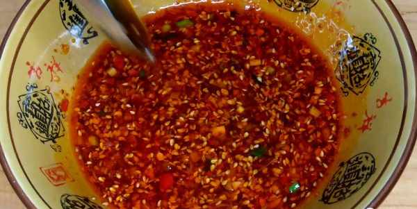 接下来再准备一个小碗,加入两勺蒜末,一勺葱花,再来一勺辣椒粉,不喜欢吃辣的可以不用放,再放入一勺白芝麻以及一小勺的食用盐,再用热油泡在里面,进一步激发出香味,用小勺子给它搅拌一下,再往里面加入一勺生抽、酱油,一勺陈醋,再加入一小勺白糖提味儿,少许的小磨香油提味增香,然后用勺子给它搅拌均匀,这样我们的料汁就调好了。