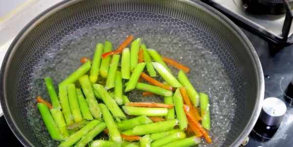 另外,很多人都想知道炒芦笋前到底焯不焯水,焯水多久才是合理的?这里告诉大家,焯水是必须的,简单焯一下水,不仅能大大缩短芦笋炒制的时间,更方便入味。锅中水烧开后,加勺盐和食用油,倒芦笋焯水30秒捞出,切记不要去过凉水。