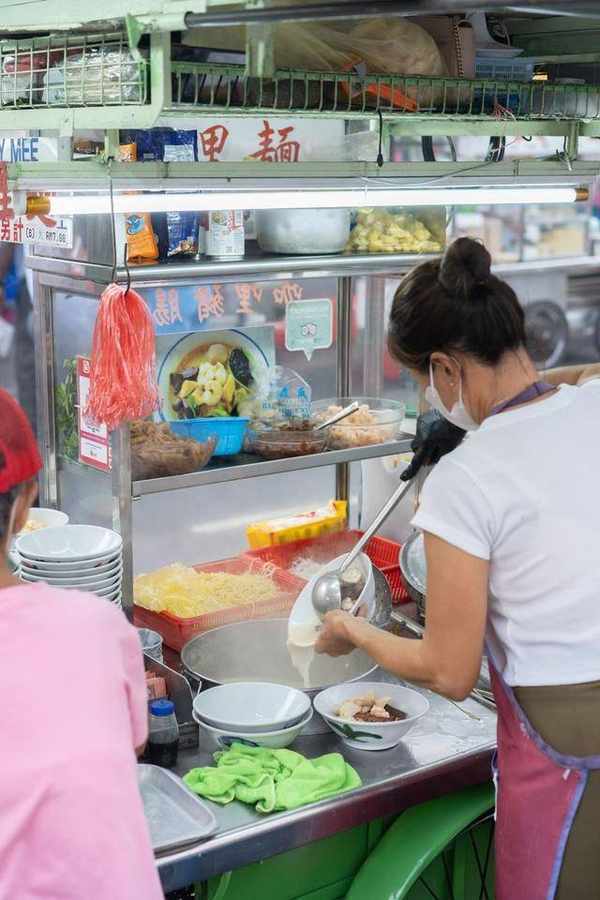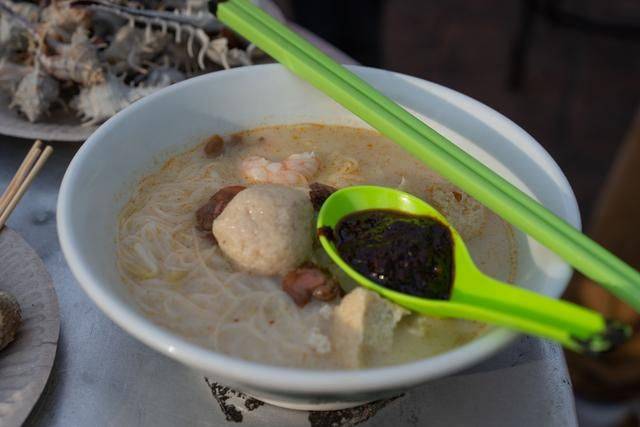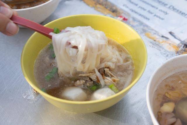 除了传统的云吞之外,槟城纽冷美食街还有一种特别的云吞面,它是由煮熟的云吞和面条一起放在一碗汤里,配上一些青菜和煎葱油,味道非常美味。