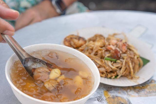 槟城汕头街四果汤是一种传统的汕头街小吃,传说中汕头街有四大天王,分别是四果汤、阿婆虾饺、鸡脚冻和鱼蛋粉。其中四果汤是其中之一,它是由白果、莲子、红豆和桂圆肉这四种水果或干果混合煮熟而成的。有浓郁的桂圆香气,里面还有口感QQ的白果,汤熬制的刚刚好,绝对是佐餐的关键利器啊,放了冰块,暑气全无!