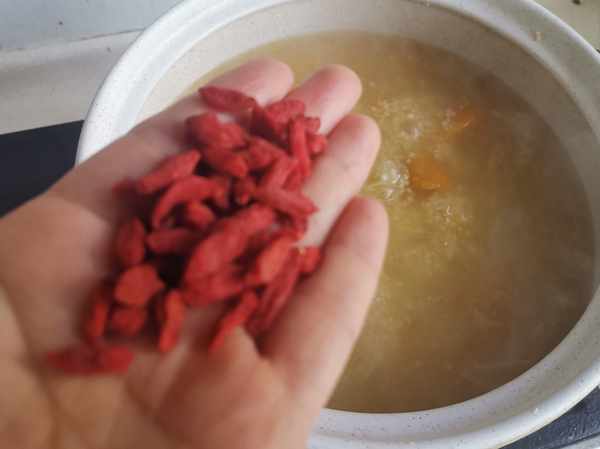 第七步:這時候,粥看起來已經很濃稠了,加入少許枸杞,即可關火。