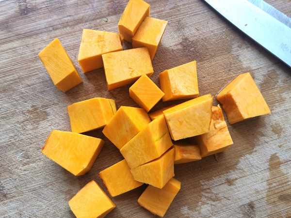 第二步:南瓜去皮切成小塊備用。南瓜是這個季節上市的果蔬之一,甜面好吃很受大家的歡迎,做粥更是可以新增粥的口感和味道。